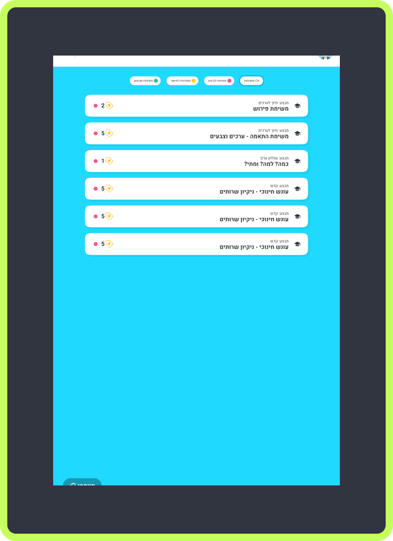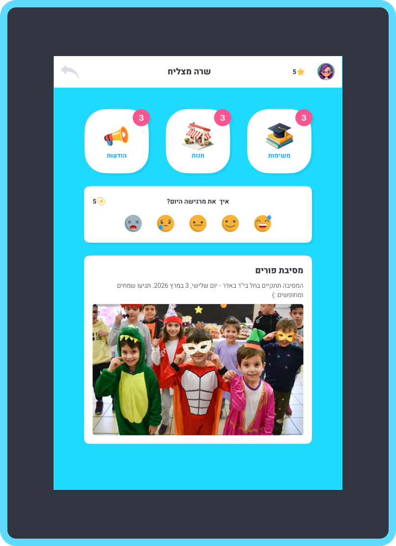 המערכת מאפשרת לנהל משימות לימודיות ואישיות בצורה מסודרת וברורה לתלמיד דרך האזור האישי שלו. המשימות מוצגות בצורה נגישה, עם תאריך, יעד ותגמול. התלמיד יודע בדיוק מה מצופה ממנו, יכול לעקוב אחר ההתקדמות ולחוות תחושת הצלחה עם כל משימה שהושלמה.